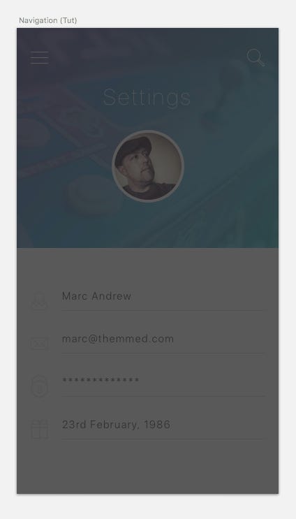 Firstly, select all of the elements from the Settings Artboard, and then holding Alt (which will duplicate them in the process), drag those elements across to your Navigation Artboard.